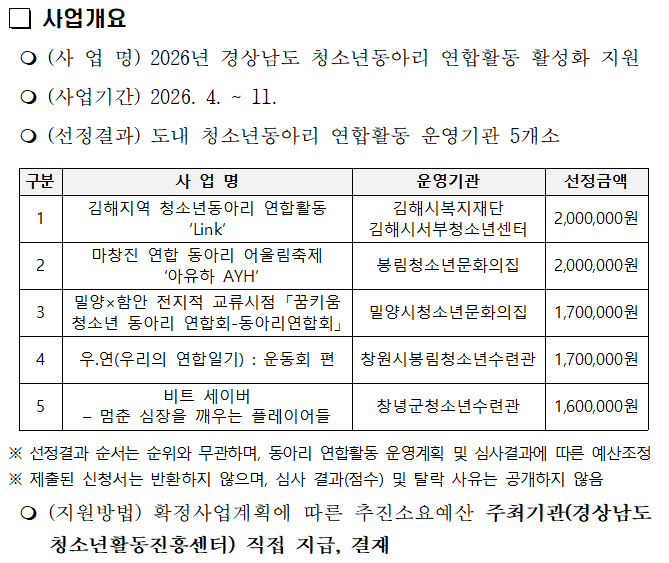 『2026년 경상남도 청소년동아리 연합활동 활성화 지원사업』선정결과 안내 |